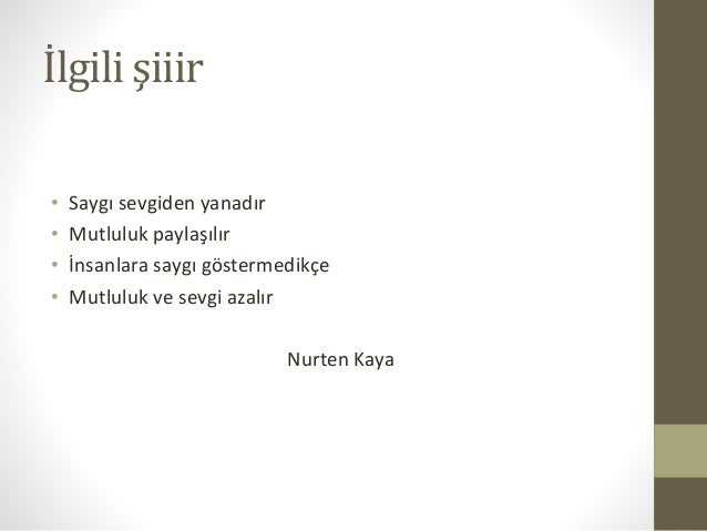 Sevgi dediğimiz bir ırmak Dağlar denizler onunla aşılacak. Değerler eğitimi kapsamında saygı ile ilgili kısa şiirlerimiz hakkında da yorumlarınızı belirtmeyi ihmal etmeyin lütfen. Babana hürmet et ki çocukların da sana hürmet etsin HzAli 2.